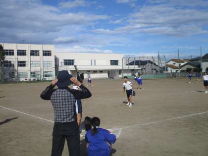 グラウンドでソフトボールを行いました。強風の中ですが、ルールを確認しながらプレーしていました。