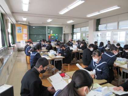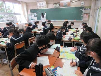 <写真上>1年社会地理 ヨーロッパ州 <写真下>1年美術 確認テストの振り返り