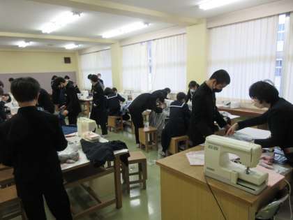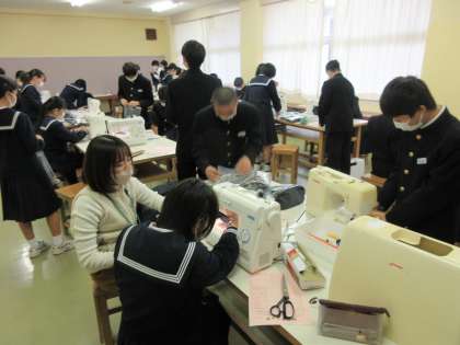 2年家庭科ではミシンを使って半ズボンを制作しています。手順の確認が大切ですね!