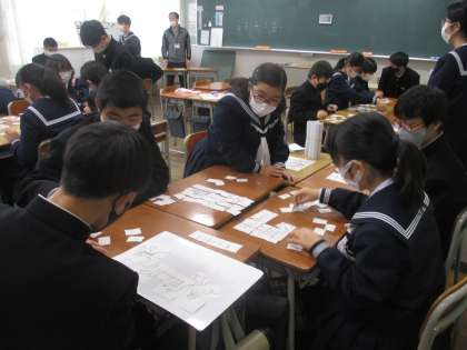 1学年 学級レクリエーション 公開日 2022/12/08 更新日 2022/12/08 第1学年 今日は学級レクリエーションしました。班でオリジナルのパズル作りをしたり、お題を組み合わせて作った文の伝言ゲームをしたりして楽しい時間を過ごすことができました。
