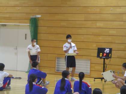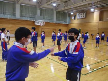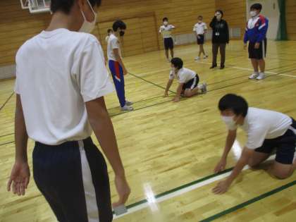 学年レクリエーションの様子です。1つめの競技はジェスチャー伝言ゲームです。12人、身振り手振りでお題を伝えています。