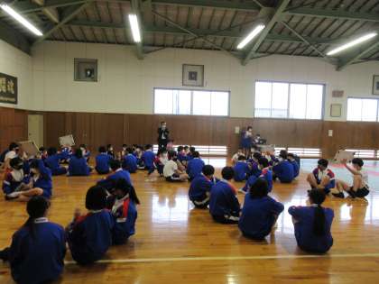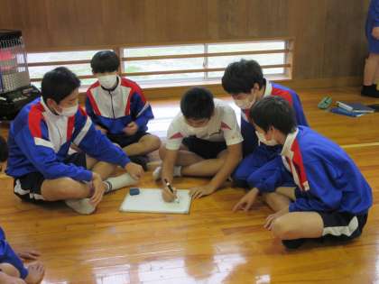 イントロゲームの様子です。中学生が知っている曲の他に、先生方世代の曲がいくつく火ありました。