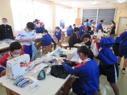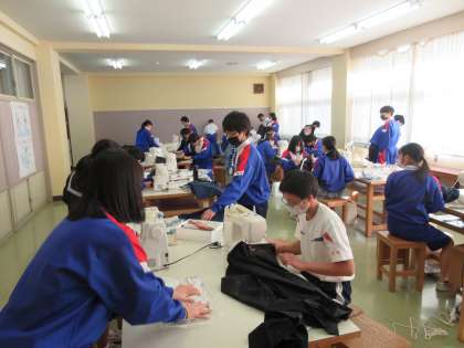 2年家庭科 ハーフパンツが完成しました。仕上がりはぜひ自分ではいてみて確かめてみましょう!