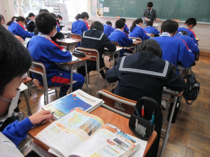 <写真上>1年保健体育 <写真中>1年社会 北アメリカ州 <写真下>2年英語 ペア学習