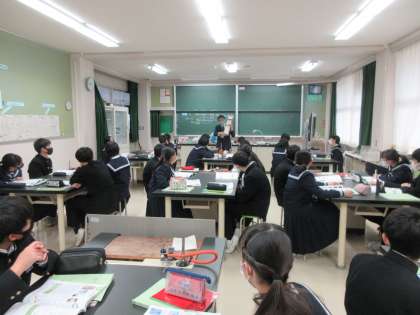 <写真上>1年音楽 アルトリコーダー <写真中>1年理科 音の性質(モノコード)