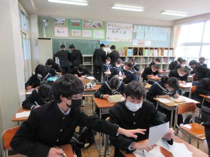 学年末考査に向けてがんばっています! 公開日 2023/02/17 更新日 2023/02/17 第2学年 16日(木)に数学の勉強会を行いました。教室に入りきらないくらいたくさんの生徒が集まって、黙々と問題を解いたり、友達と教え合ったりと熱心に問題に取り組んでいました。この土日にも今までの学習の見直しをしましょう。がんばれ水中生!