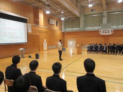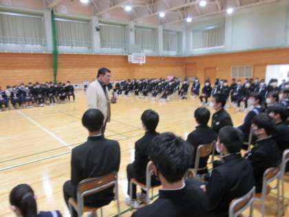 本日5・6限は、腰塚勇人さんをお招きし「命の授業〜ドリー夢メーカーと今を生きる〜」と題して三成中と合同で講演会を行いました。生徒達は事前にクロムブックでビデオ動画を視聴していたため、腰塚さんの事故からの復帰のエピソードについては周知していました。しかし、実際に腰塚さんから話を聞き、大きく心を揺さぶられた教職員や生徒が多かったのではないかと思います。