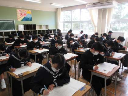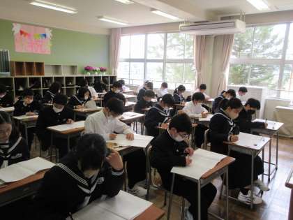 4/11(火)中学校生活初のテスト「中1学力調査」がありました。小学校の総復習になっているテストで、どの生徒も真剣に取り組んでいました。明日は社会と英語のテストです。がんばれ!1年生!