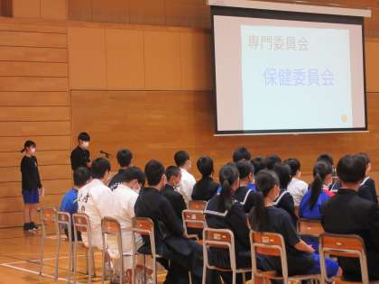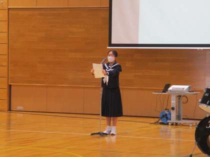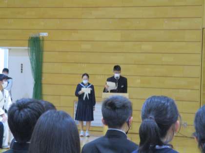 4/11の5・6時間目に新入生歓迎会を行いました。写真は生徒会入会式の様子です。執行部と各委員会の代表が生徒会活動について説明しました。