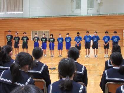 部活動紹介の様子です。2・3年生が全校生徒の前で部活動の成果を発表しました。会場が拍手で包まれ、温かい時間になりました。