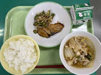 ごはん、ちゃんこ鍋、 ふくらぎの照り焼き ごま、牛乳、牛乳