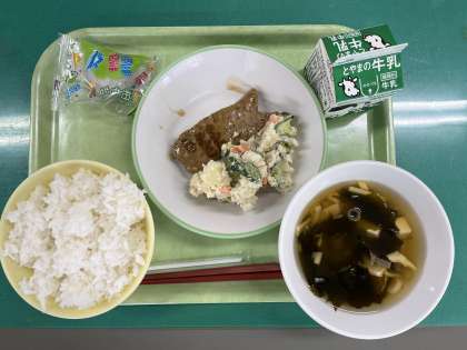 今日の給食は、こどもの日献立です。 こいのぼりハンバーグ、ごまサラダサラダ、 かしわ餅、若竹、ごはん、牛乳