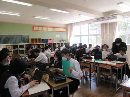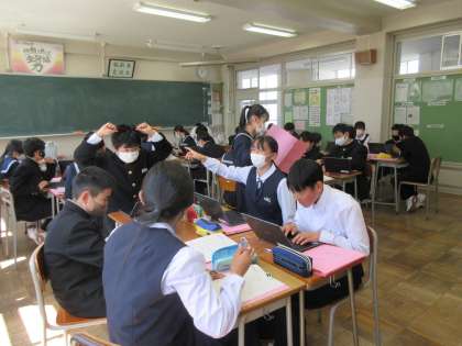 1学年では、高岡班別学習のコースを考えています。各自で調べた高岡の名所を出し合って、学習テーマが達成できるコースを考えました。協力して考えることによって、学びと友情を深めてほしいです。