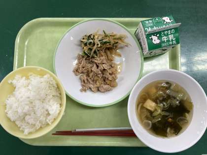 今日の給食は ごはん、牛乳、豚肉の生姜焼き、ナムル、中華スープ