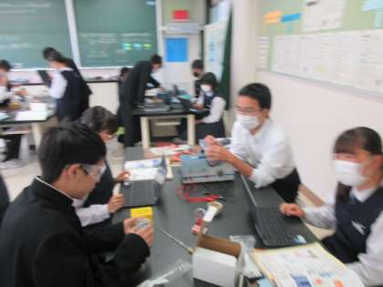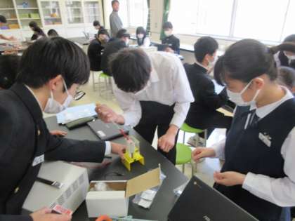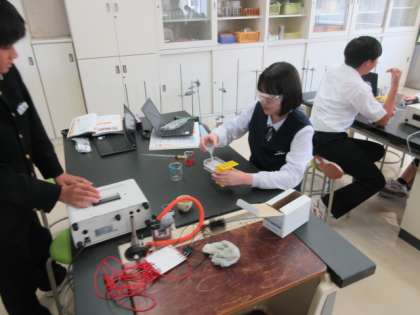 3年理科 塩酸の電気分解をしています。発生した気体の近くに赤インクを落とすと色が消えることに驚いていました。