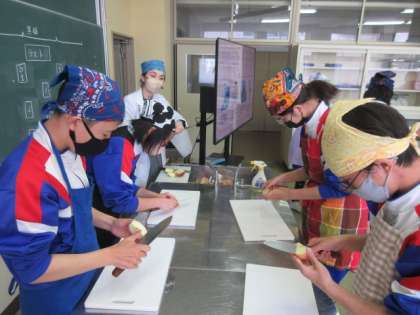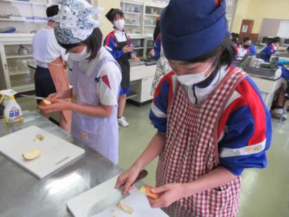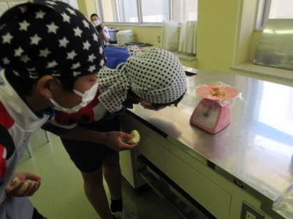 今日はリンゴの皮むきの実習です。リンゴの芯を取り、皮をむいて食べられる部分と廃棄する部分の割合についてはかりで重さを計測し、計算しました。