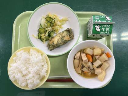今日の給食 <献立> ごはん 牛乳 魚の磯辺揚げ あわせ和え 筑前だき