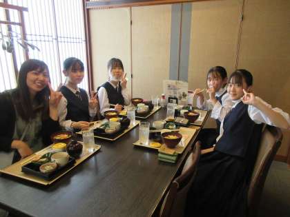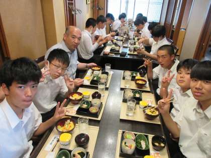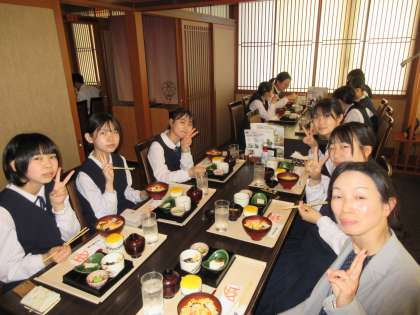 和食料理店「かごの屋」でこの旅の最後の食事でした。会場はA組B組分かれていましたが、料理はどちらも同じでした。ちらし寿司や酢の物などの和食をごちそうになりました。