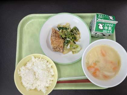 <献立> ごはん 牛乳 魚の竜田揚げ 小松菜ひたし 呉汁