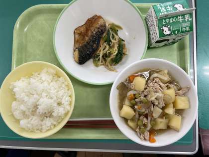 <献立> ごはん 牛乳 さばの塩焼き 香味和え 豚肉の南蛮煮