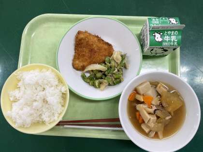<献立> ごはん 牛乳 あじフライ グリーンアスパラのごま炒め 高野豆腐と冬瓜の煮物