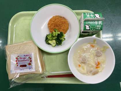 <献立> 食パン 牛乳 メンチカツ グリーンサラダ 白花豆の米粉シチュー いちごジャム