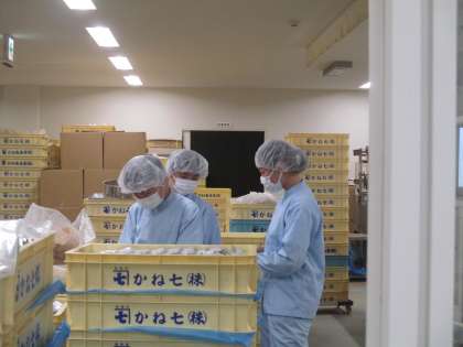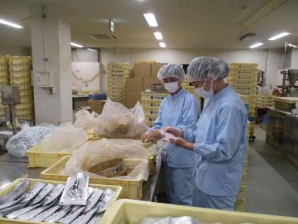 工場の中で、だしパックの粉をふるいにかける作業や製品を段ボールに入れる出荷前の作業に従事していました。まじめに、集中して作業に取り組んでいます!