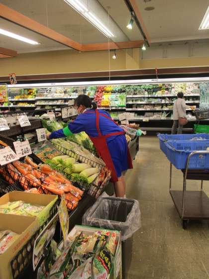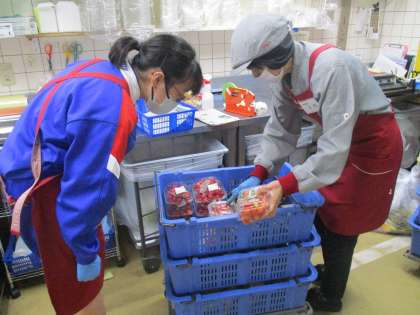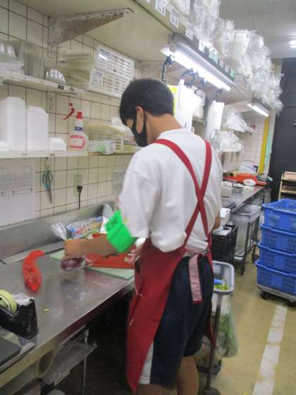 本校と他校の生徒と一緒に活動していました。野菜の品出しや裏で野菜の袋詰めや値札貼り作業をしていました。