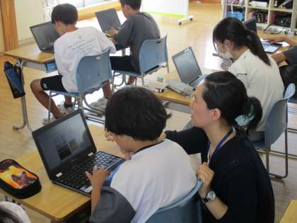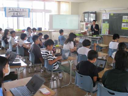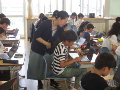 本日午前中、近隣の小学6年生が本校美術科教員による出前授業を体験しました。「ポスターのおもしろさを見つけよう」という課題で、クロームブックを使用したデジタルポスター制作に挑戦しました。