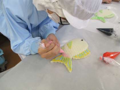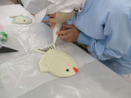 シール貼り、かまぼこやにしんの袋詰めを午前中に体験し、最終日の今日は細工かまぼこ体験をさせていただいています。みんな楽しそうに一人一人思いを込めてかまぼこを作っていました。