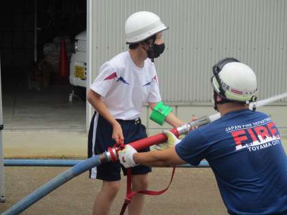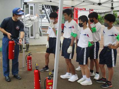 本日最終日で活動を振り返っていました。生徒達は、「綱を渡るトレーニングが大変だった」と話します。また、煙がある状態を想定して目隠しをした状態で救助訓練をしたり、消火器が取り扱いやすい場所にあるか査察したり、筋トレを行ったりと、充実した5日間を過ごしていたようです。