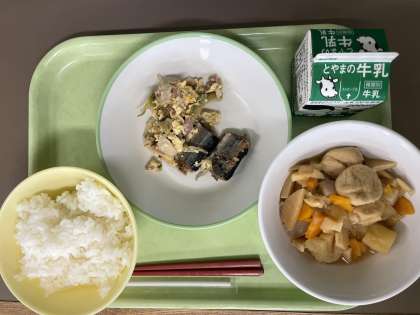 <献立> ごはん 牛乳 さんまの生姜味 ベーコンとゴーヤの卵炒め 炊き合わせ