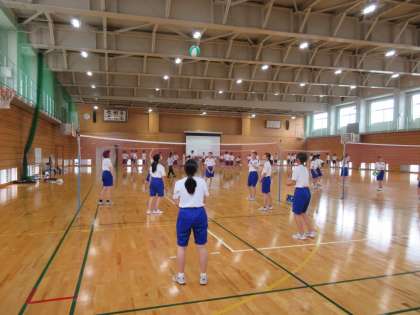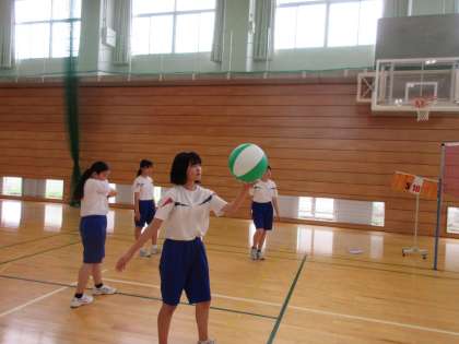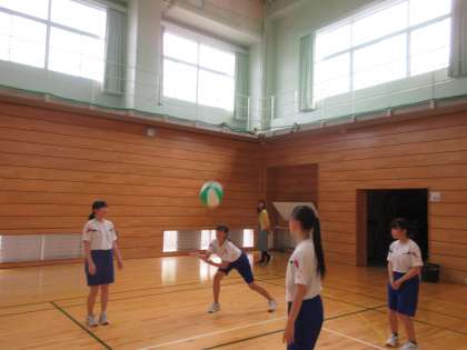 写真はビーチボール大会の様子です。前半は男女に分かれて、後半は男女混合で試合をしました。どのチームも気迫あふれる試合が展開されていました。