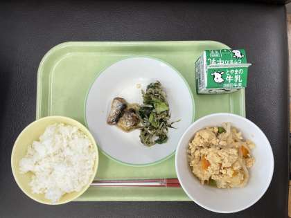 <献立> ごはん 牛乳 いわしのマーマレード煮 チンゲンサイひたし 高野豆腐の錦とじ