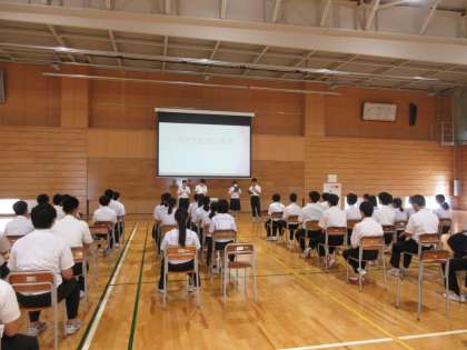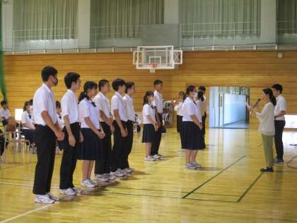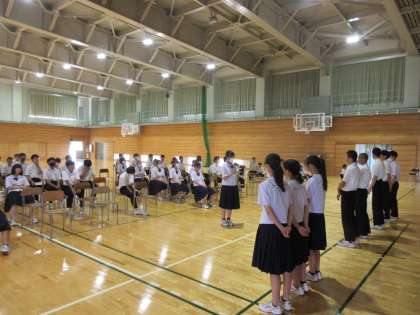 学年集会では1学期を振り返っての反省や夏休み中の学習、生活などについてのお話がありました。また、学級MVPの発表や北信越大会・全国大会に進出する生徒への激励、1学期を振り返っての動画もありました。お互いのよいところを認め、エールを送り、大きな拍手によって体育館が温かい雰囲気に包まれました。