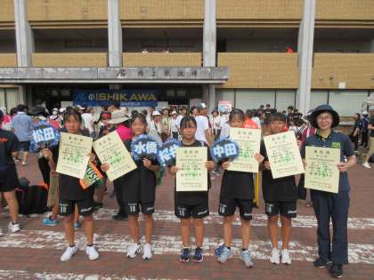 36度の猛暑の中、最後まで諦めず、バトンをつなぎ、走り抜けました。会場で水橋中学校がコールされたときには富山県勢から大きな声援がありました。