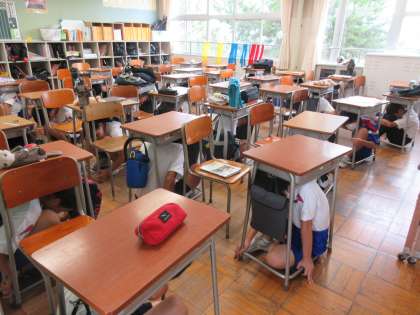 1「Drop!」まず低く、2「Cover」頭を守る、3「Hold on!」動かない を徹底しました。