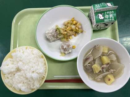<今日の献立> ごはん 牛乳 珍珠丸子 コーン和え さつま汁