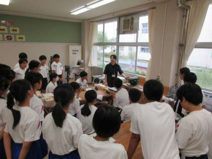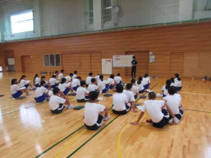 <写真上>1年技術科 ベルトサンダーの説明 <写真下>2年保健体育 実技の事前指導