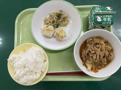 <今日の献立> ごはん 牛乳 にんじんシューマイ 塩ナムル 回鍋肉