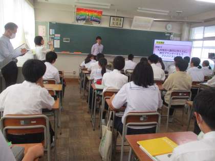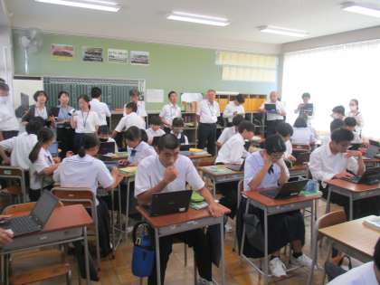 本校は「GIGAスクール構想推進モデル校」に指定されており、一人一台端末を活用した授業実践に取り組んでいます。本日は2Aで社会科の公開授業が行われ、多くの先生方に参観していただきました。