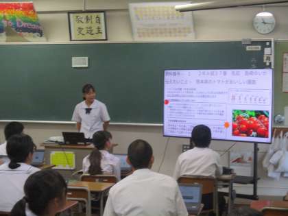 本校は「GIGAスクール構想推進モデル校」に指定されており、一人一台端末を活用した授業実践に取り組んでいます。本日は2Aで社会科の公開授業が行われ、多くの先生方に参観していただきました。