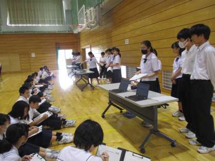 「社会に学ぶ『14歳の挑戦』」発表会 公開日 2023/09/29 更新日 2023/09/29 最近の水中の様子 本日6限に、「社会に学ぶ『14歳の挑戦』」で体験したことや感じたことについて、2年生から1年生に向けた発表会が行われました。1年生が分かりやすいスライドを見せたり、クイズを交えて発表したりと、工夫を凝らして発表しました。1年生は熱心にメモをとったり、質問したりと、積極的に臨んでいました。