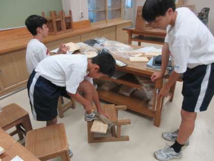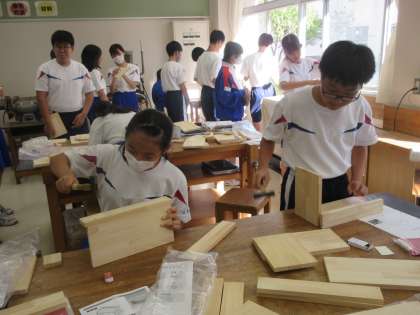 1年 生活に役立つ製品づくり 公開日 2023/10/02 更新日 2023/10/02 第1学年 1年技術科の授業で木材を用いた生活に役立つ製品づくりを行っています。生徒は、見慣れない工具に戸惑いつつ、安全に作業しています。出来上がった作品は10/20(金)に行われる学習発表会で展示します。是非ご覧下さい。