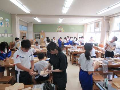 「木材を用いて生活に役立つ製品をつくろう」をテーマに自分の作業ペースで作品を作りました。仲間と協力しながら、工具を上手に使っていました。