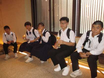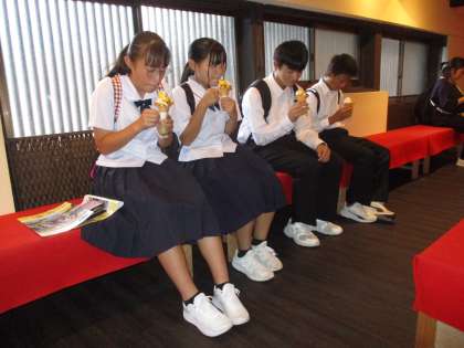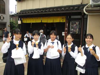 ひがし茶屋街で、金沢名物「金箔ソフトクリーム」を味わって食べています。生徒たちの間で大人気でした。