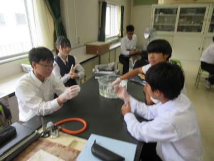 「水中の物体にはたらく上向きの力」について実験しました。水の入った水槽に手を入れることでビニール手袋が手にはりついてくる感覚を体感しました。