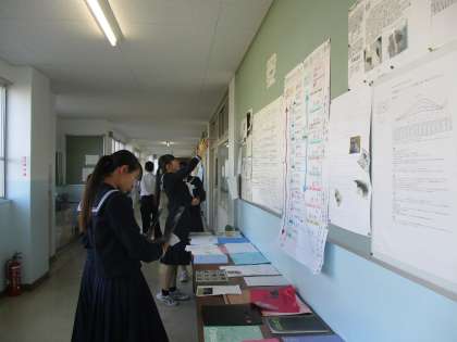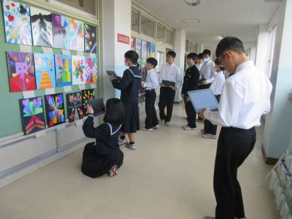 学習発表会 作品展示 公開日 2023/10/21 更新日 2023/10/21 最近の水中の様子 合唱コンクール前に、生徒たちは校内に展示してある作品を鑑賞しました。ありとあらゆる作品を熱心に見入っていました。クロムブックで鑑賞レポートをまとめるために、写真を撮ったり、印象に残った理由を入力しながら、楽しく鑑賞していました。