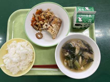 <今日の献立> ごはん 牛乳 魚の甘みそかけ 五目煮豆 うすくず汁