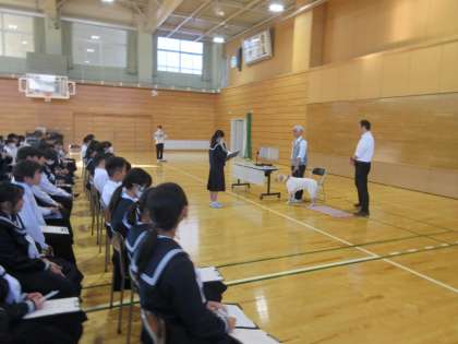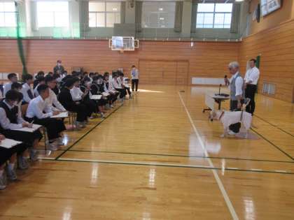1年 盲導犬講座 公開日 2023/10/31 更新日 2023/10/31 第1学年 10/31(火)「総合的な学習の時間」の「福祉体験学習」の一環として「盲導犬講座」を行いました。 盲導犬ユーザーの方を講師にお迎えして、視覚障害や盲導犬について教えていただきました。また、実際に講師の方と盲導犬のきずなちゃんとのコミュニケーションの取り方を見せていただきました。生徒は、お互いに信頼しているからこそ、できることなのだと強く感じたようです。